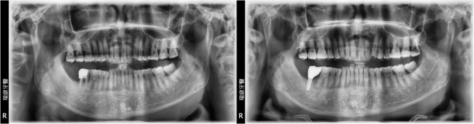 治療計劃 : 將右下後牙拔除後,等待三個月癒合期,進行人工植牙, 三個月後接出假牙基座印模製作正式假牙!